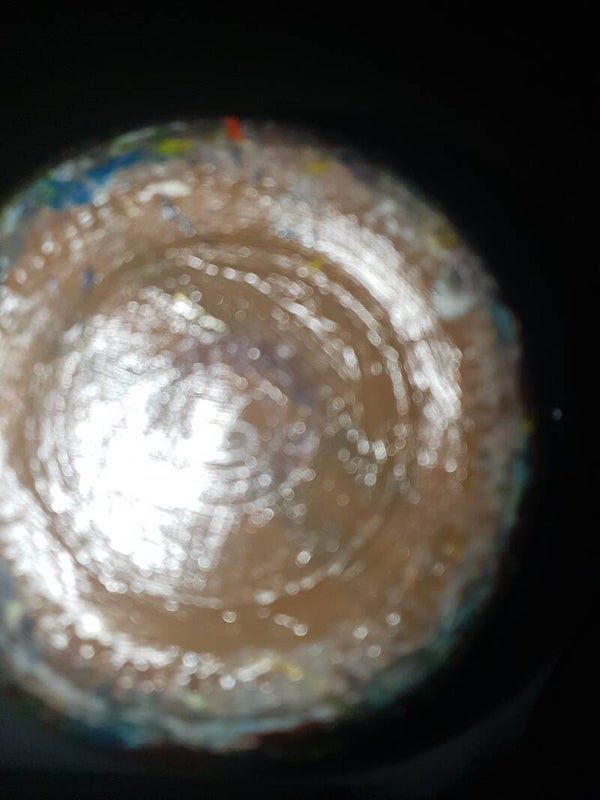 Exclusive colorful Mustard Vase - object, one of a kind, handmade in Den Haag, made by artist, use feathers to paint with, layer on layer, special, exclusive, unique, quality vase - object.