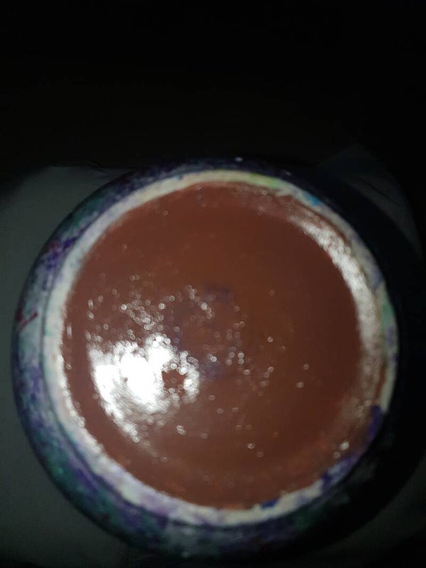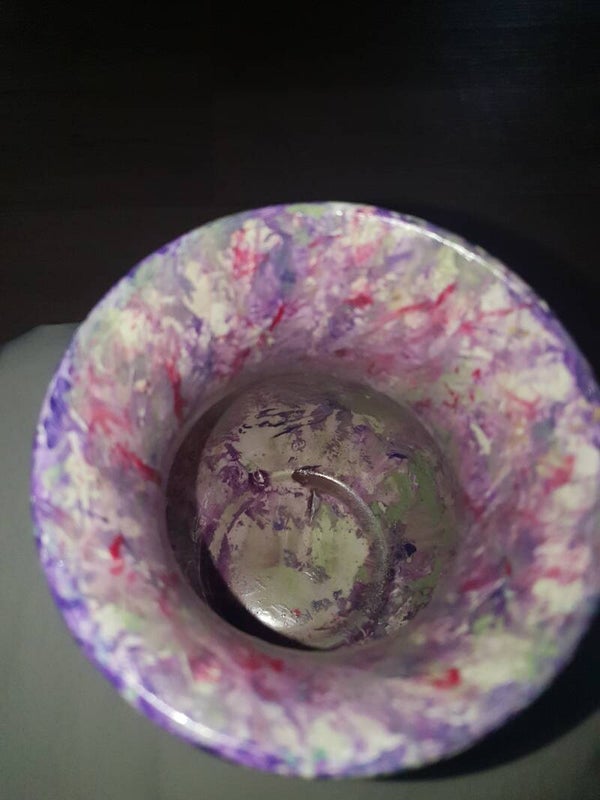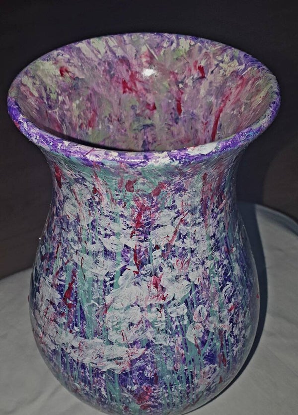 Beautiful colorful Vase - object, one of a kind, handmade Den Haag, made by artist, use feathers to paint with, layer on layer, special, exclusive, unique, quality Vase - object. colors purple, blue, white. Include stamps.