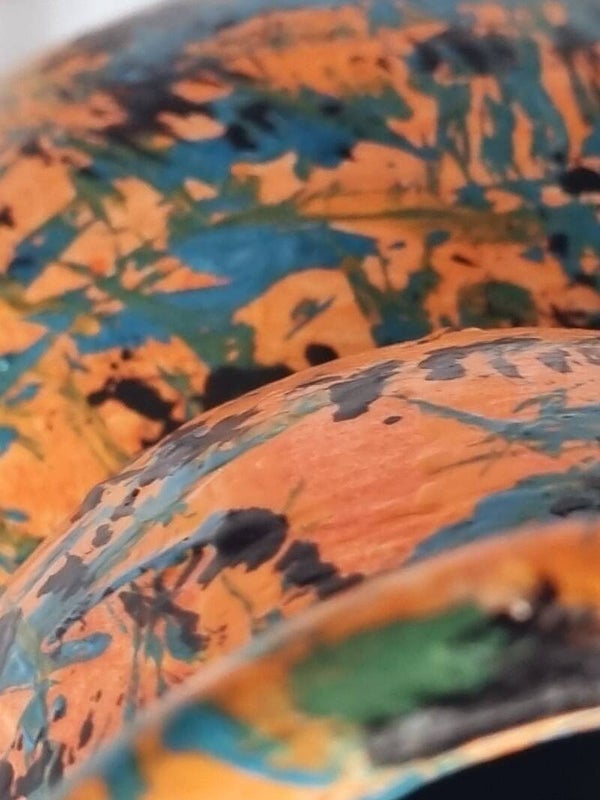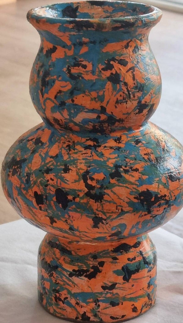 Use feathers to paint with nature materials, layer on layer, special, exclusive, unique, quality vase. color orange, with some blue and black. Include stamps on the back.
