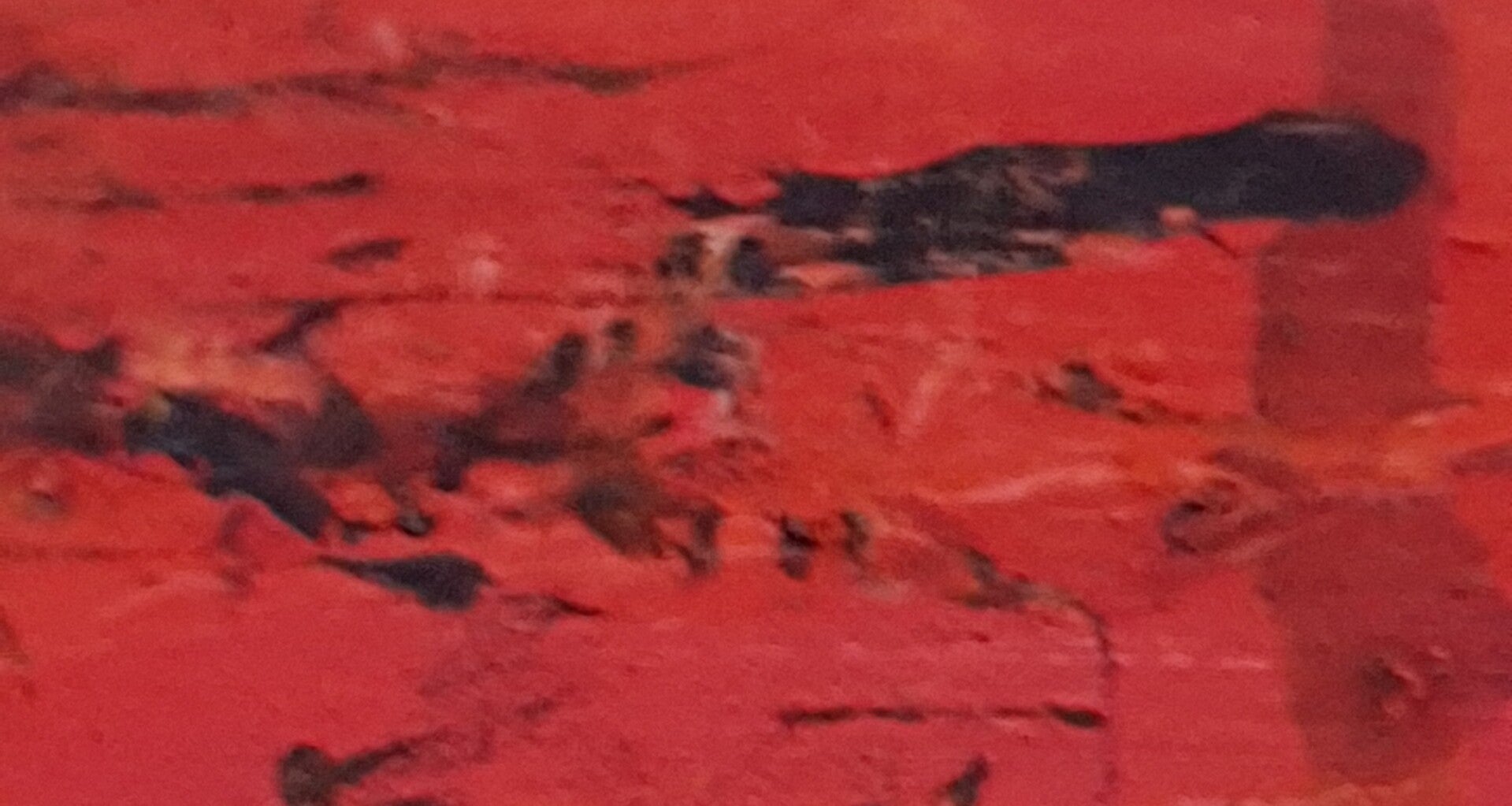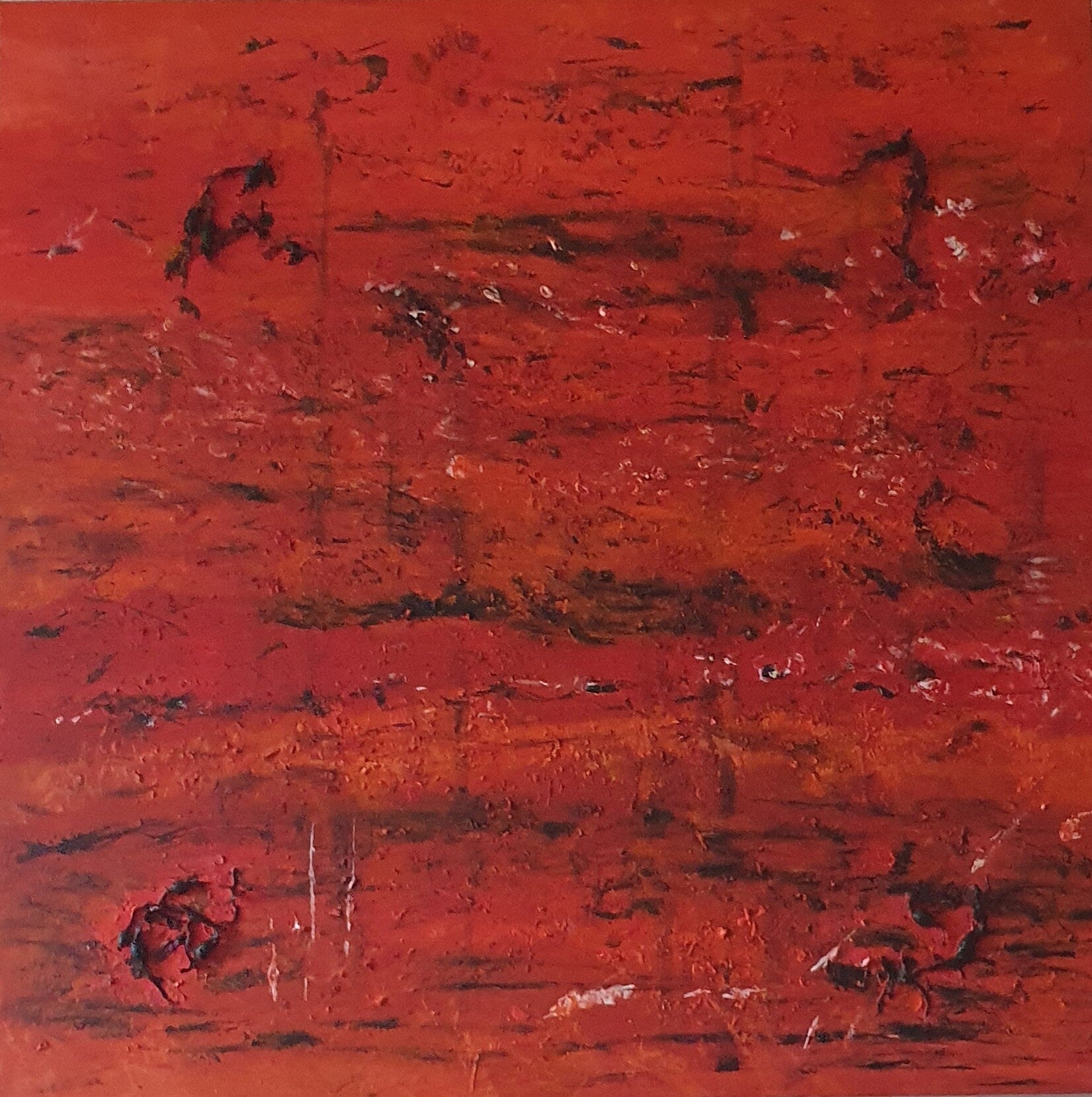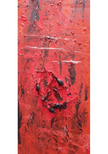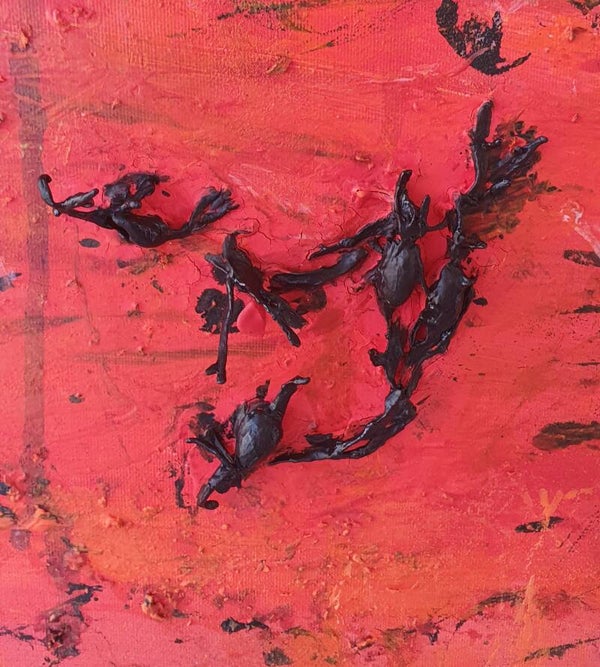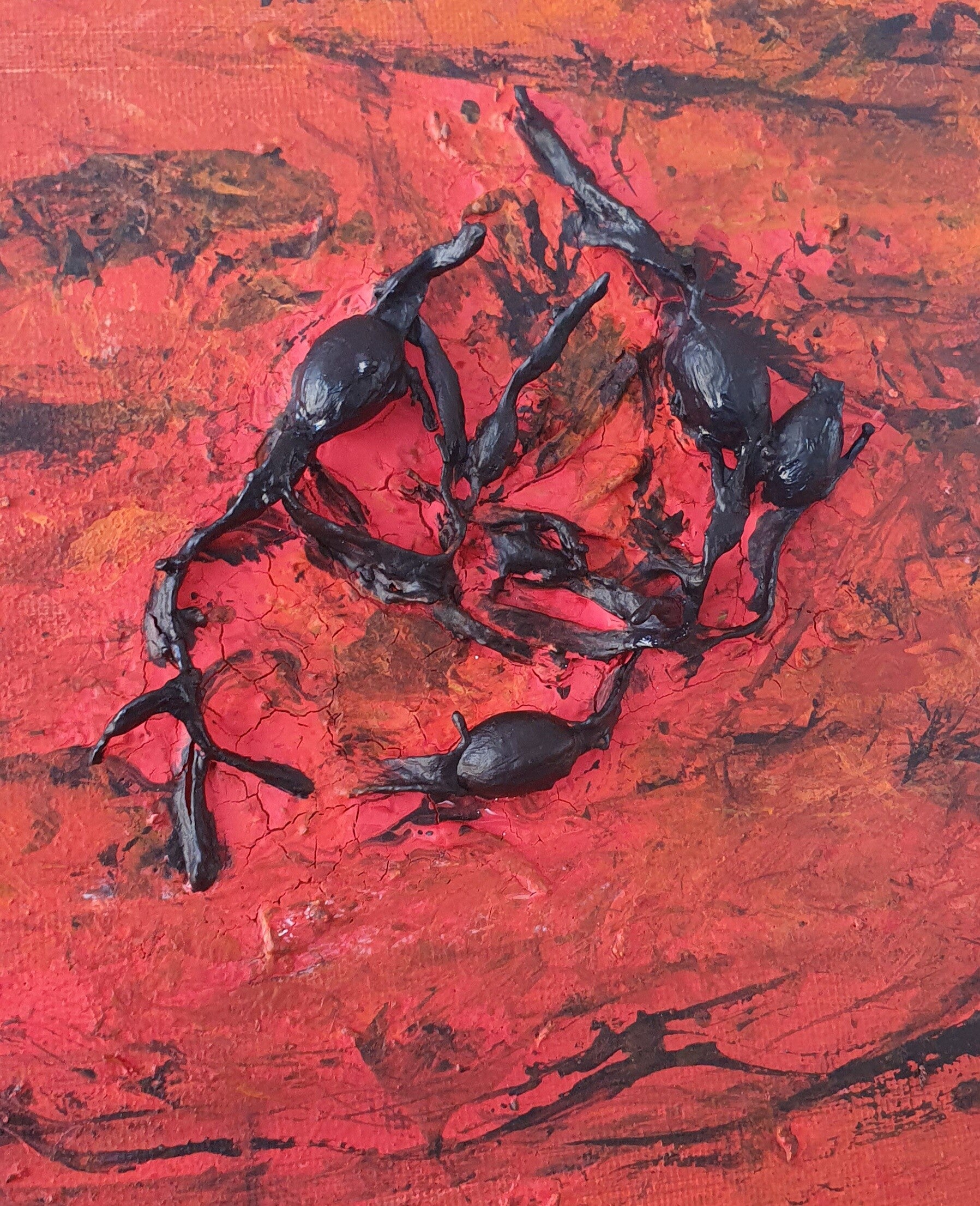 Acrylic on cotton, with feathers (13 layers), seaweed (23 layers), flour, sand, knife, dried flowers